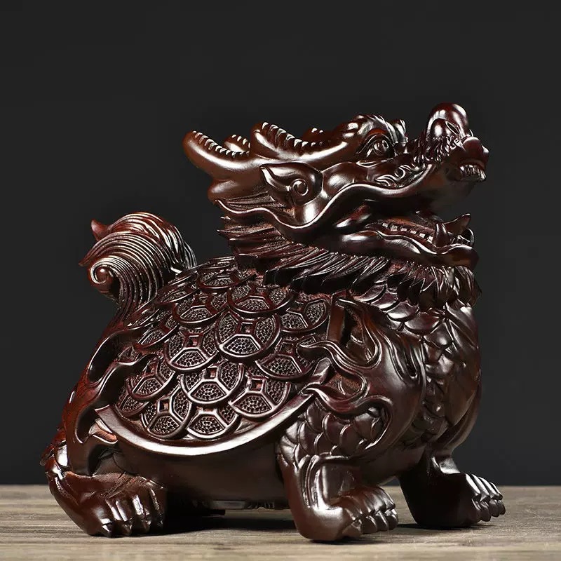 Product Name: Hand-Carved Ebony Wood Dragon Turtle (Money Coin & Bagua) DecorMaterial: Premium solid ebony wood (dense natural grain, smooth hand-polished finish)Design & Craftsmanship: