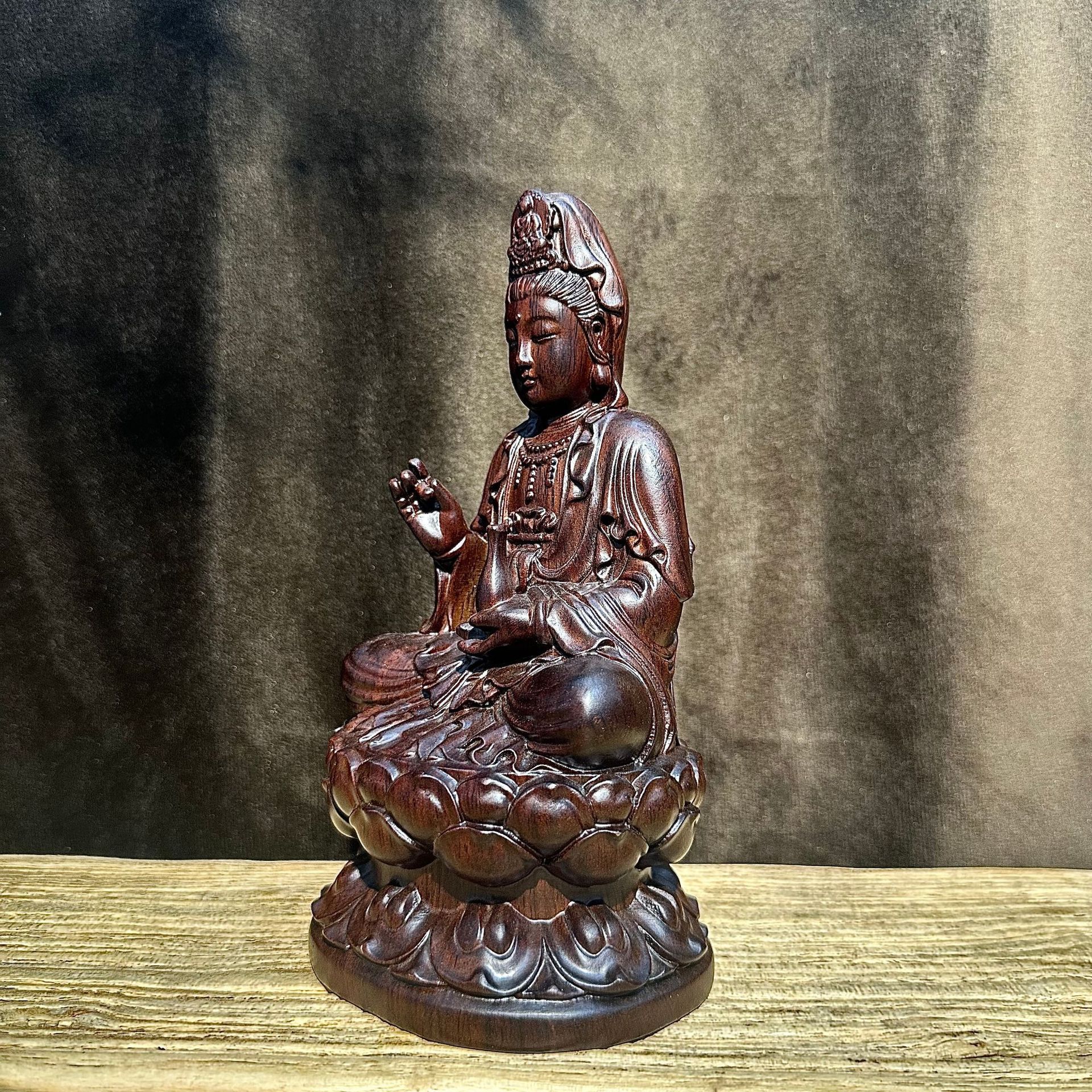Product Name: Hand-Carved Ebony Wood Lotus-Seated Guanyin StatueMaterial: Premium solid ebony wood (deep dark grain, smooth hand-polished finish)Design & Craftsmanship: