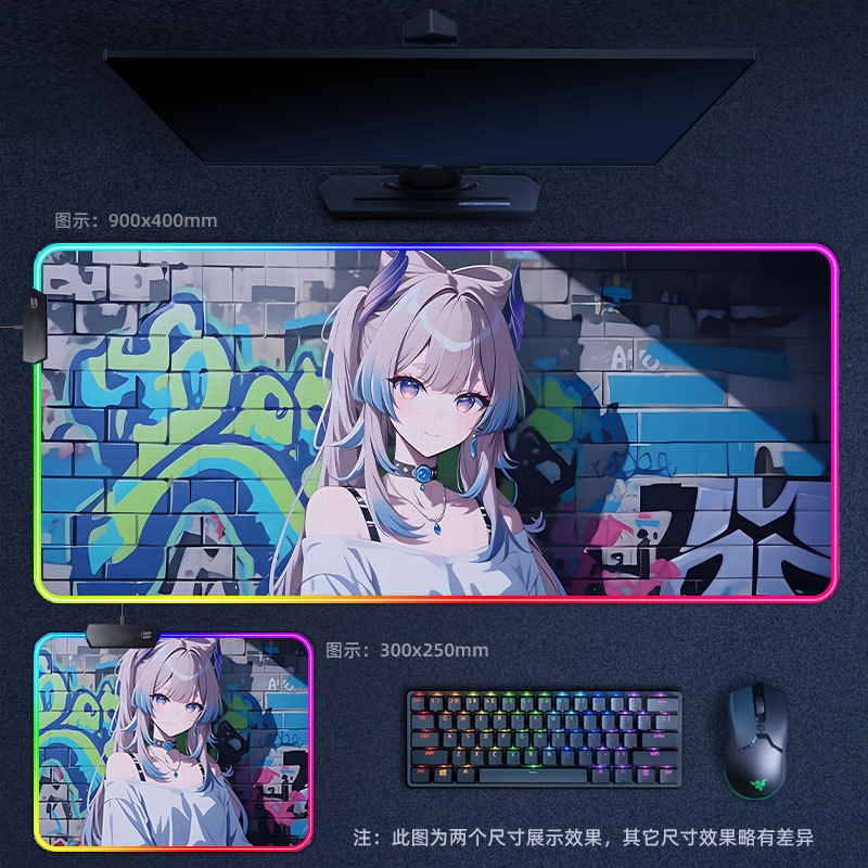 This Genshin Impact – themed RGB – lit mouse pad, featuring Keqing in a vibrant graffiti style, comes in multiple sizes. With its extra – large and thick design, it offers ample space and comfort for office tasks and gaming. The RGB lighting adds a lively touch, and the high – quality surface ensures precise mouse control.