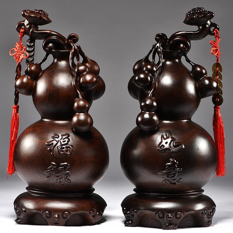 Product Name: Hand-Carved Ebony Wood “Fu Lu Ru Yi” Gourd Pair FigurinesMaterial: Premium ebony wood (deep dense grain; smooth polished glossy finish)Design Features: