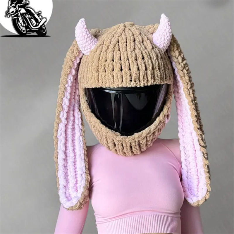 Elevate your riding style with this handmade crochet motorcycle helmet cover featuring a charming lamb-horn bunny design. Perfect for riders who want to infuse their gear with cuteness and individuality, this cover turns your helmet into a unique fashion piece on the road.Crafted entirely by hand using soft, durable crochet material, it fits most motorcycle helmets snugly while offering protection against scratches and minor bumps. The warm beige and pink color palette, combined with adorable bunny ears and delicate lamb horns, creates a look that’s both playful and stylish. Whether you’re commuting in the city or exploring scenic routes, this helmet cover ensures you ride with personality and comfort.