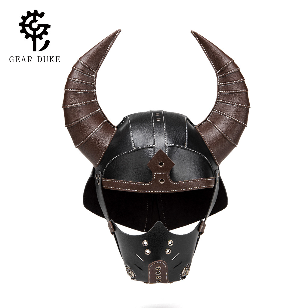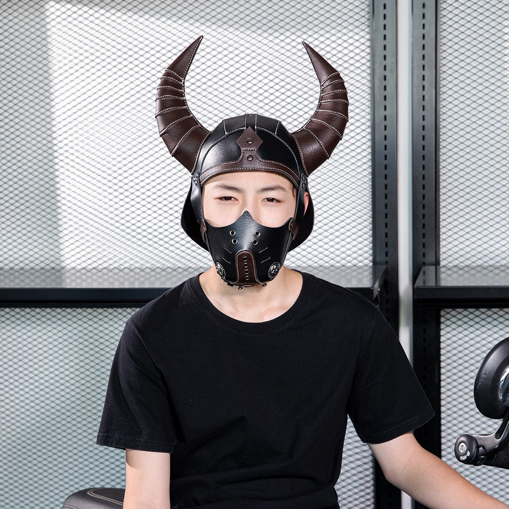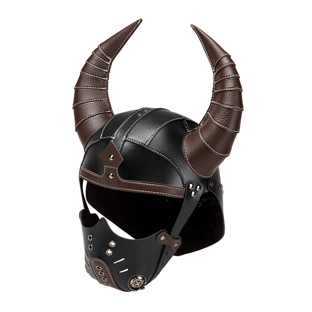 Made from high-quality faux leather (sturdy yet lightweight for all-day wear), this helmet features a black base with rich brown accents (on the curved horns and decorative straps) and detailed white stitching that highlights its rugged, handcrafted vibe. The large, sweeping horns (a iconic Viking design element) add height and drama, while the integrated lower mask (with eye cutouts and metal-style rivet details) completes the fierce medieval aesthetic.