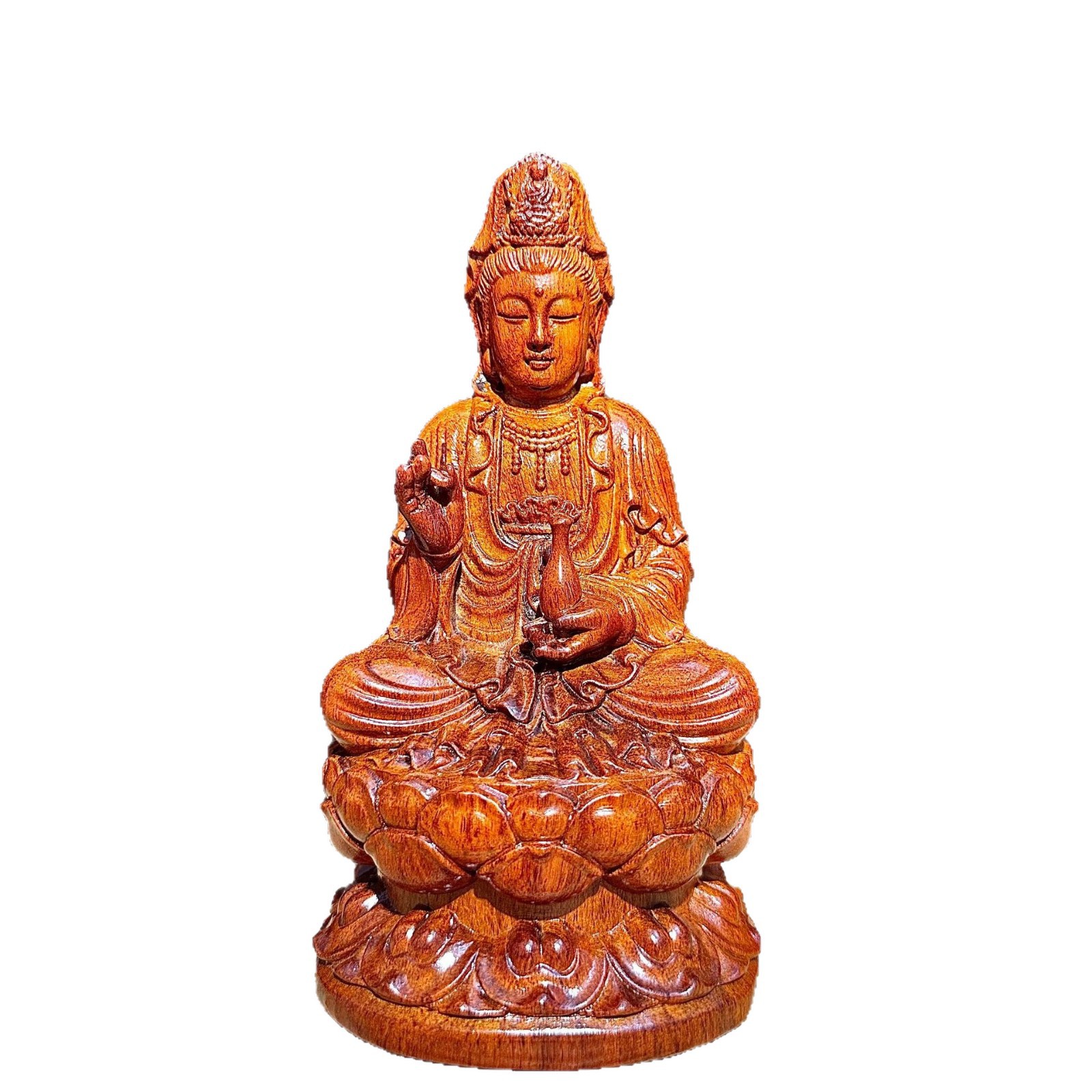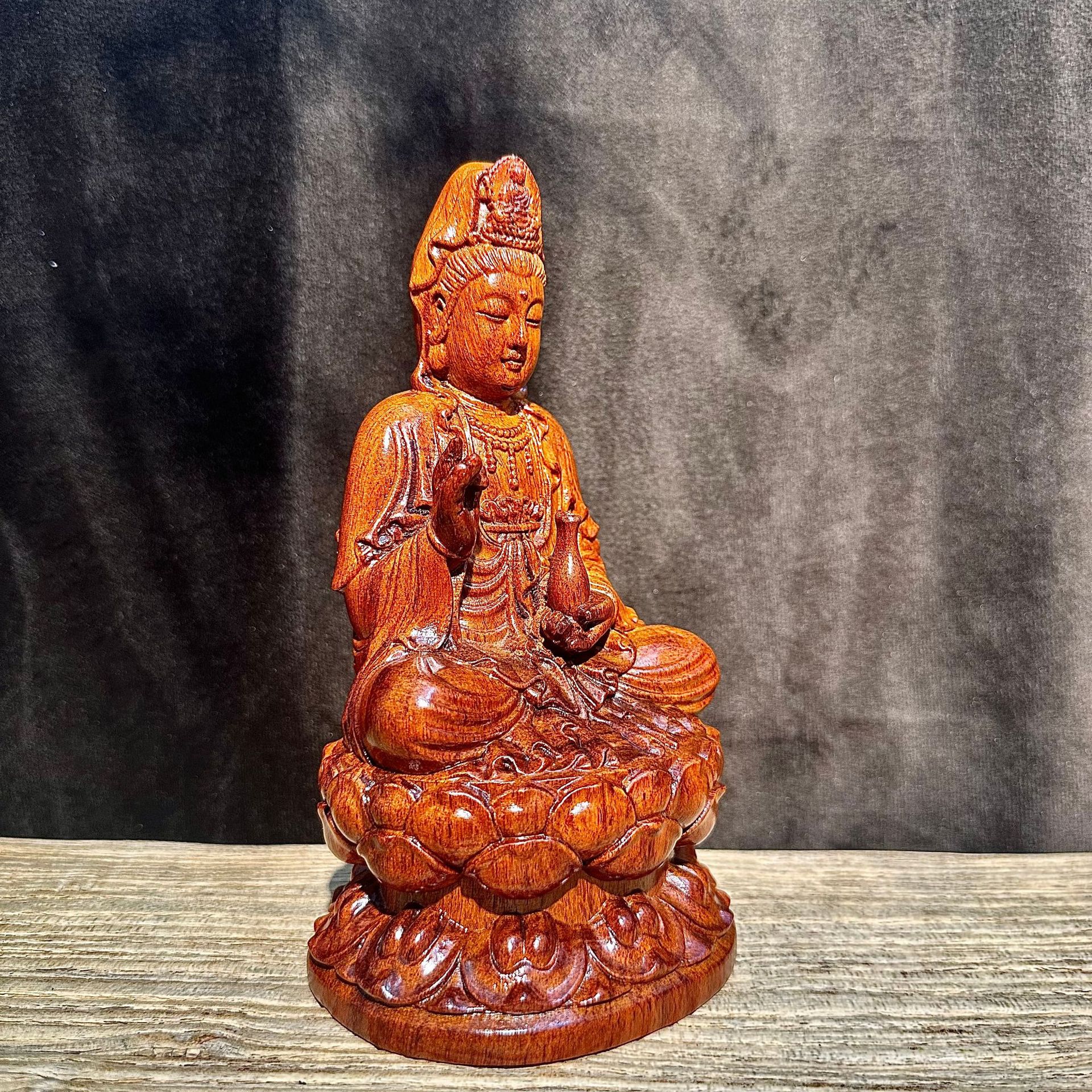 Product Name: Hand-Carved Rosewood Lotus-Seated Guanyin StatueMaterial: Premium solid rosewood (warm reddish-brown grain, smooth hand-polished finish)Design & Craftsmanship: